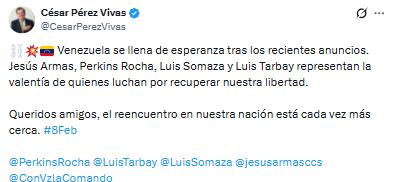 Del mismo modo, el exgobernador del estado Táchira, César Pérez Vivas, celebró la noticia destacando la valentía de Jesús Armas, Perkins Rocha, Luis Somaza y Luis Tarbay en su lucha por la libertad de Venezuela.