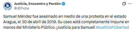 A través de su cuenta de X, la ONG Justicia, Encuentro y Perdón recordó la memoria del joven y denunció que el caso se encuentra en un estado de completa impunidad dentro de las instancias del Ministerio Público, sin que hasta la fecha se hayan determinado responsabilidades.