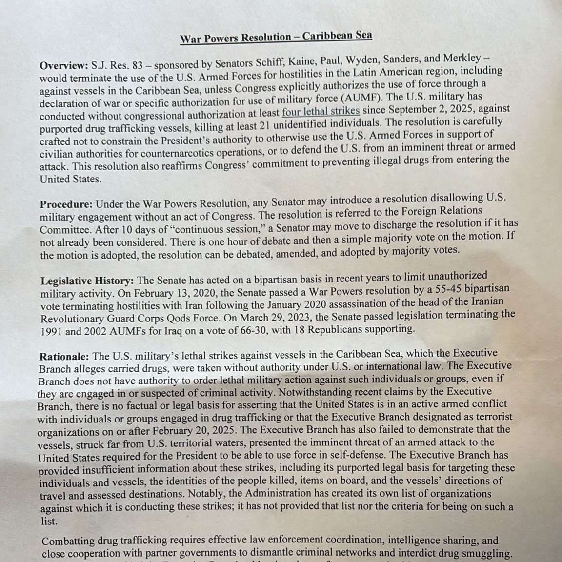 Esta resolución es una respuesta directa a la reciente política de la administración Trump, que suspendió la diplomacia y declaró un «conflicto armado no internacional» contra los carteles de la droga, utilizando esta justificación para los ataques en el Caribe.