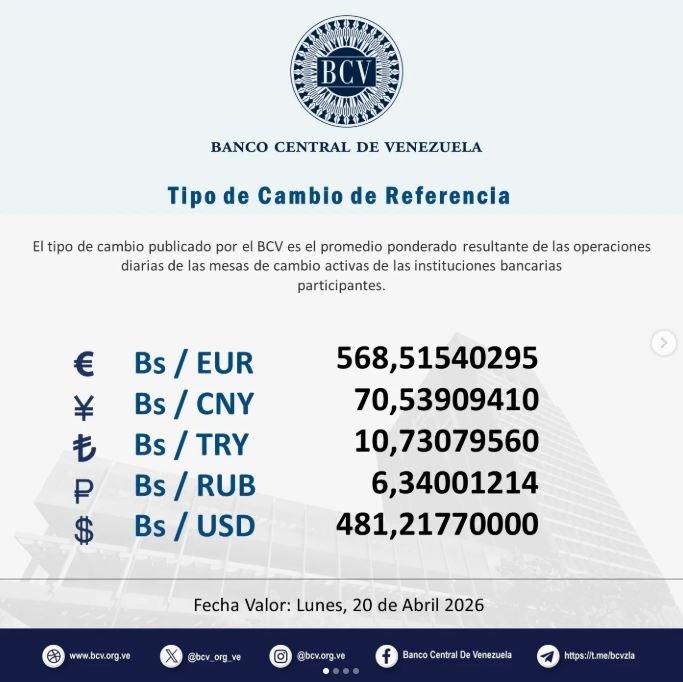 El Banco Central de Venezuela (BCV) anunció este viernes 17 de abril, el ajuste en el tipo de cambio oficial que entrará en vigencia a partir del lunes 20 de abril, posicionando a la divisa estadounidense en un nuevo máximo que profundiza la percepción de devaluación del bolívar en el mercado cambiario.