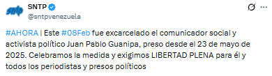 El Sindicato Nacional de Trabajadores de la Prensa (Sntp) celebró la excarcelación de Juan Pablo Guanipa este domingo 8 de febrero, destacando su labor como comunicador social además de su rol como activista político.