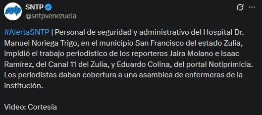 A través de una publicación en su cuenta de X, el gremio indicó que los afectados fueron los reporteros Jaira Molano e Isaac Ramírez, del Canal 11 del Zulia, y Eduardo Colina, del portal Notiprimicia.