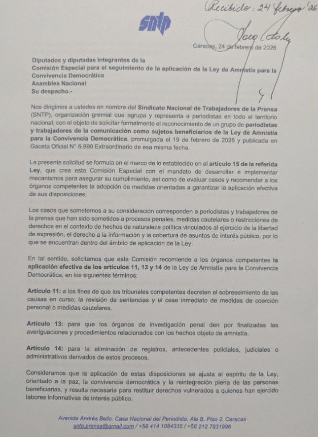 El pasado martes el Sindicato Nacional de Trabajadores de la Prensa (SNTP) presentó ante la comisión encargada del seguimiento a la Ley de Amnistía una comunicación, solicitando la revisión de los casos de 40 periodistas y trabajadores de la prensa, algunos aún detenidos y otros sometidos a medidas cautelares tras sus excarcelaciones en los últimos dos años.
