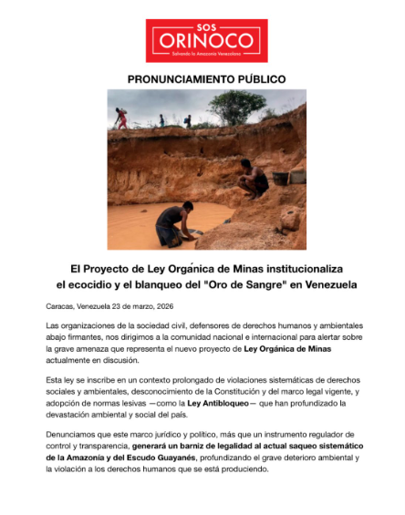 La organización no gubernamental SOS Orinoco denunció que el proyecto de «Ley de Minas» discutido por la Asamblea Nacional representa una amenaza directa para el patrimonio ecológico del país al pretender institucionalizar el ecocidio.