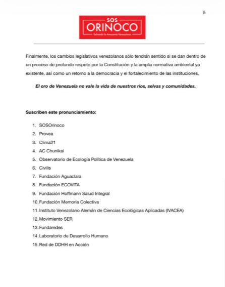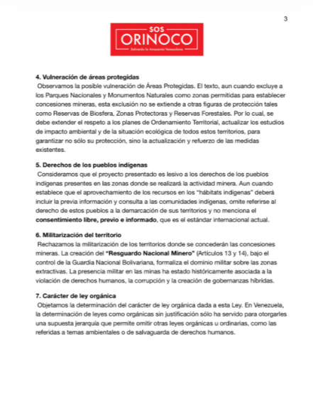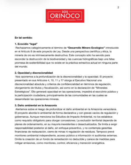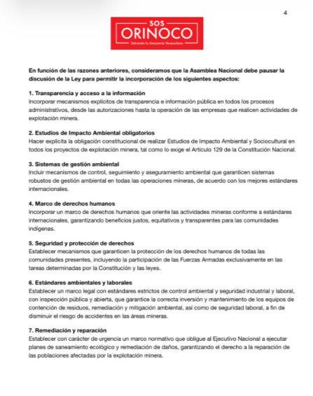 SOS Orinoco exige la paralización inmediata de la discusión legislativa para incorporar mecanismos estrictos de transparencia, estudios de impacto ambiental obligatorios y remediación de daños. La organización también rechazó la militarización del territorio mediante la creación del «Resguardo Nacional Minero», advirtiendo que el control de la Guardia Nacional Bolivariana sobre las minas históricamente ha fomentado la corrupción y la violación de derechos humanos.
