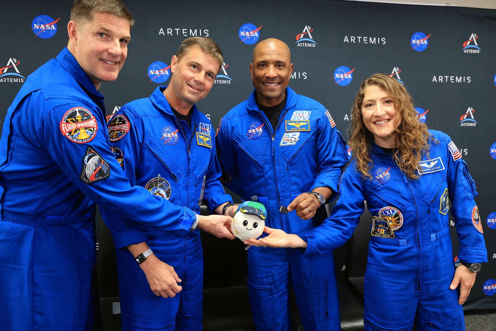 Fotografía cedida por la NASA donde aparece la tripulación de la misión Artemis II de izquierda a derecha el especialista de misión, Jeremy Hansen, de la Agencia Espacial Canadiense (CSA); el comandante Reid Wiseman, el piloto Victor Glover, y la especialista de misión Christina Koch, sosteniendo Rise, la mascota lunar e indicador de gravedad cero para el vuelo de prueba alrededor de la luna. Un niño de ocho años logró enviar a la misión Artemis II a ‘Rise’, un pequeño juguete que indica la ingravidez y acompañará por los próximos 10 días a la tripulación de la nave Orión, que espera hacer historia al llegar al lado más oculto de la Luna. EFE/Kim Shiflett