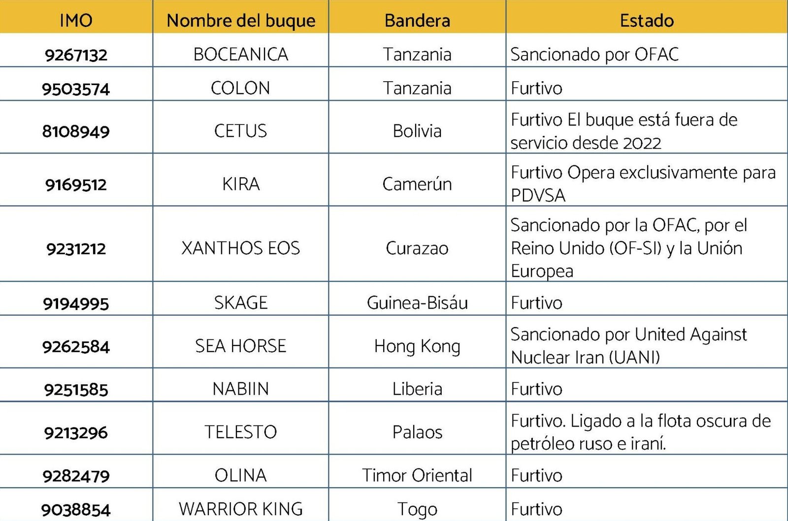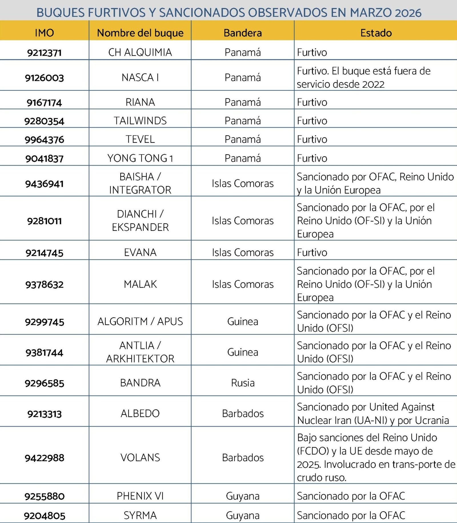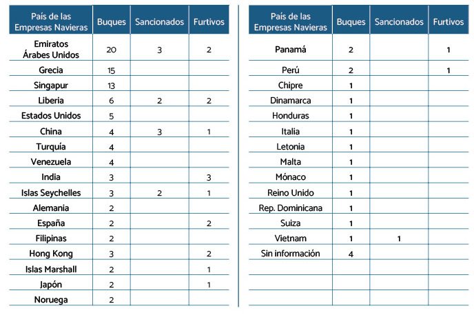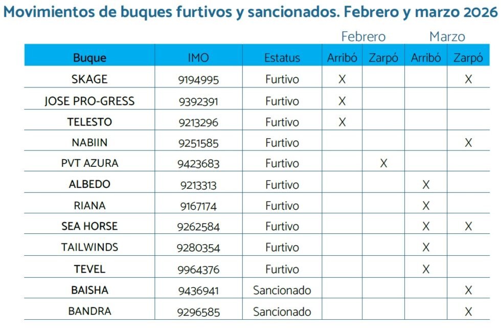 Como se detalla en el cuadro siguiente, este conjunto incluye 17 buques con bandera venezolana. Asimismo, se identificaron 25 embarcaciones sancionadas o de operación furtiva en febrero y 29 en marzo. En cuanto a las naves en “modo oscuro”, detectadas mediante imágenes satelitales, se contabilizaron 14 en febrero y 15 en marzo.
