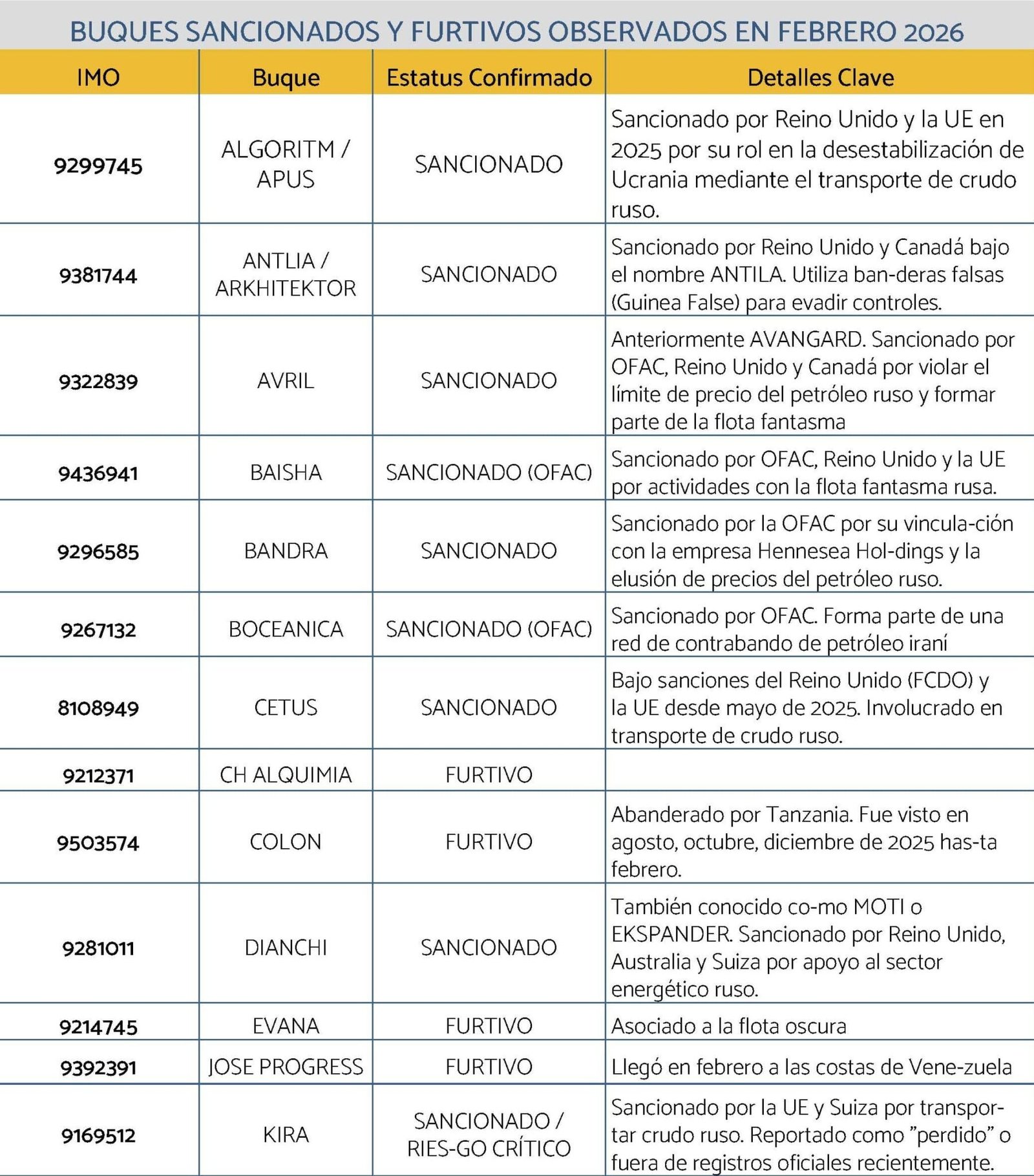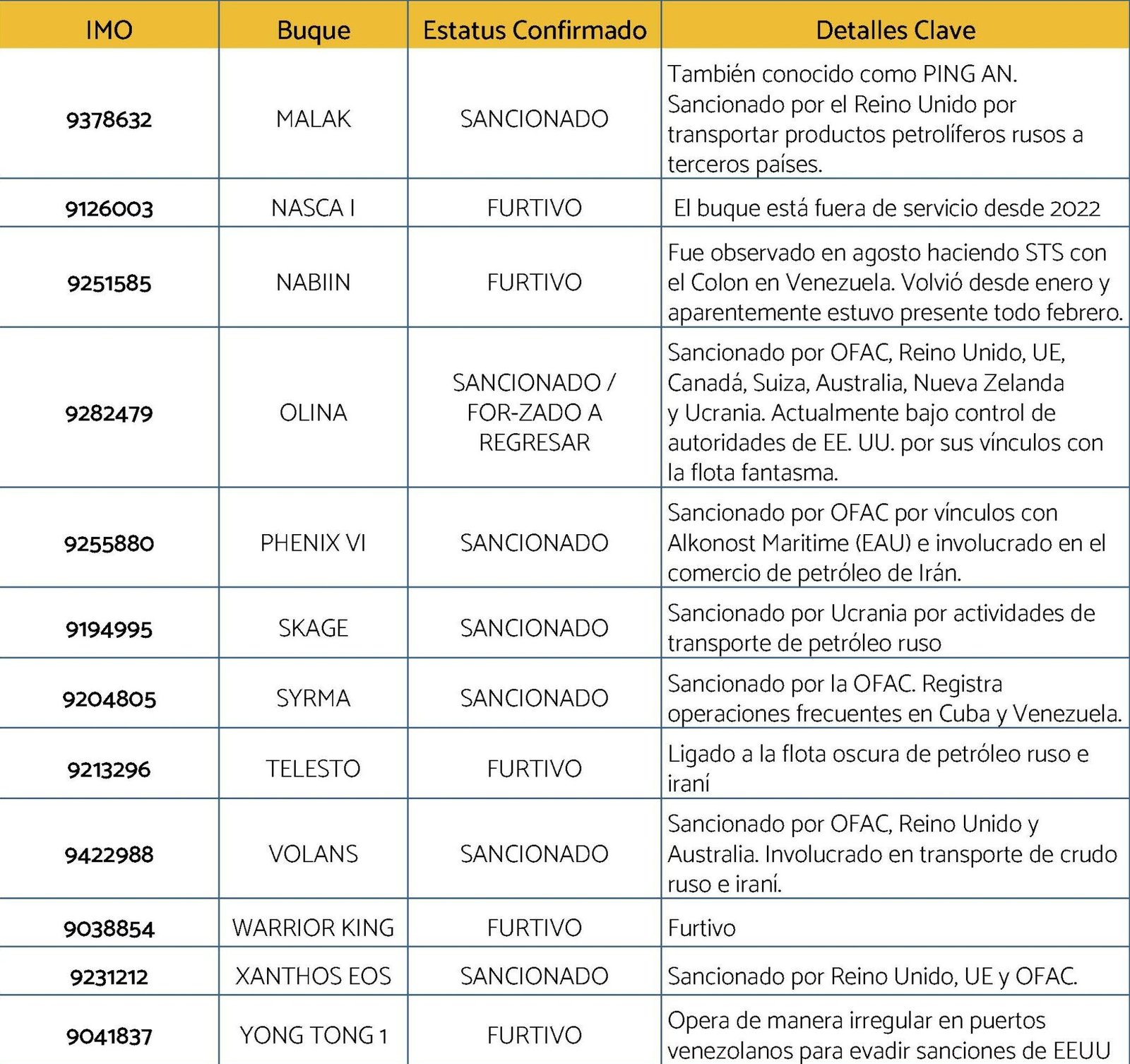 Del resto de los buques furtivos y sancionados detectados, al menos 12 están en las inmediaciones de los puertos petroleros venezolanos desde noviembre de 2025, 3 desde diciembre y 3 desde enero, haciendo cabotaje o esperando la oportunidad de salir como ya lo hicieron otros.