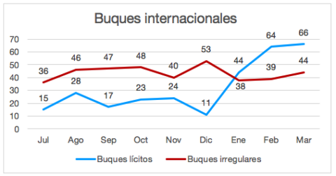 El gráfico siguiente permite vislumbrar la presencia sin grandes cambios de los buques irregulares frente al crecimiento de los buques lícitos a partir de enero de 2026.