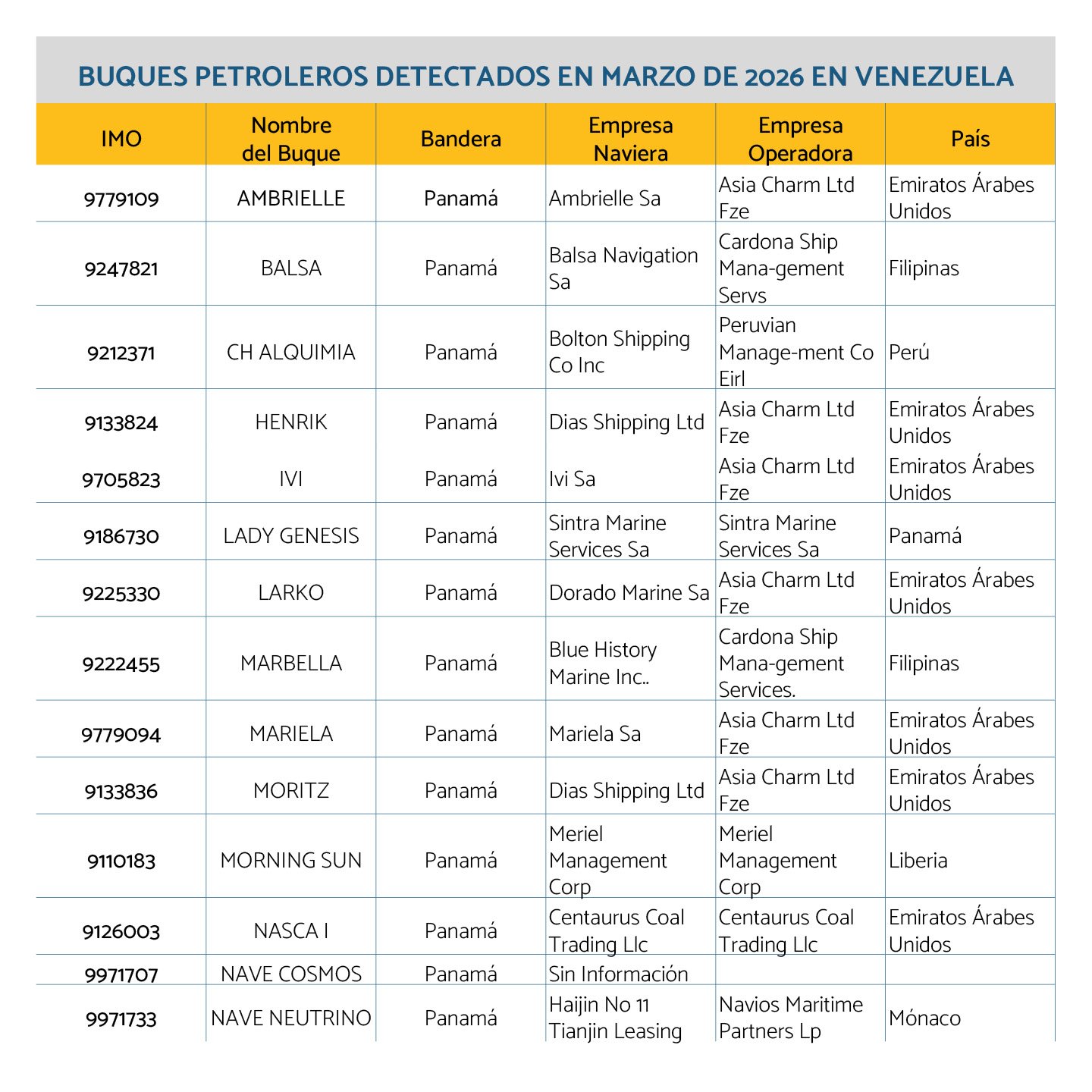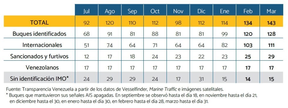 Durante febrero y marzo de 2026 se registró un incremento en el flujo de transporte de petróleo, impulsado por embarcaciones internacionales que operan dentro del marco legal. El volumen de tanqueros superó los niveles observados en los diez meses previos, alcanzando 134 en febrero y 143 en marzo.
