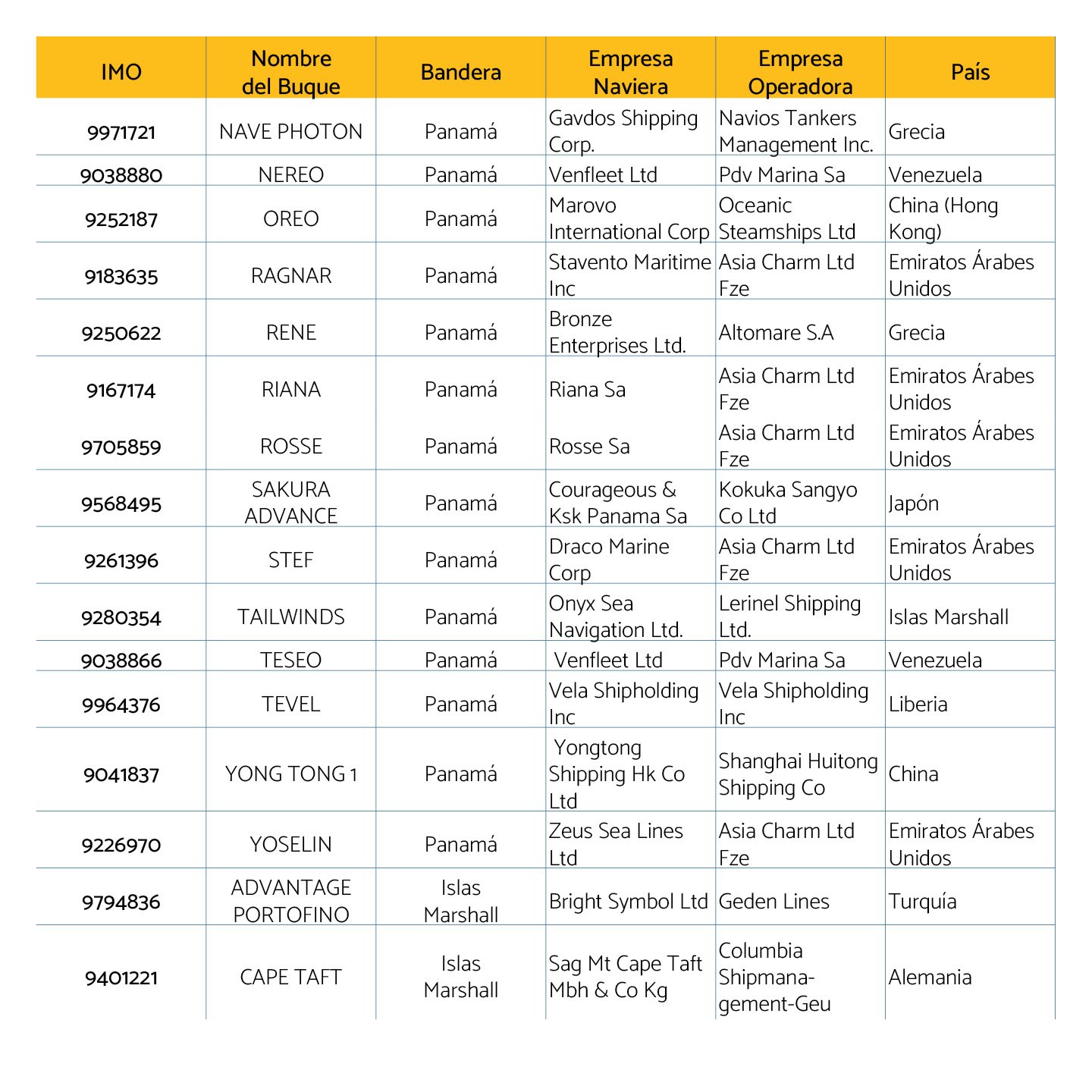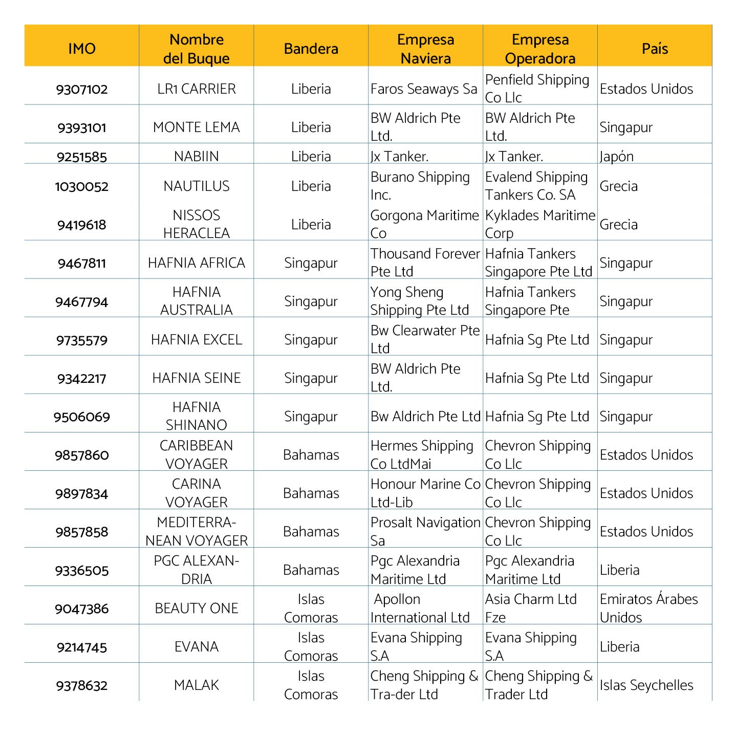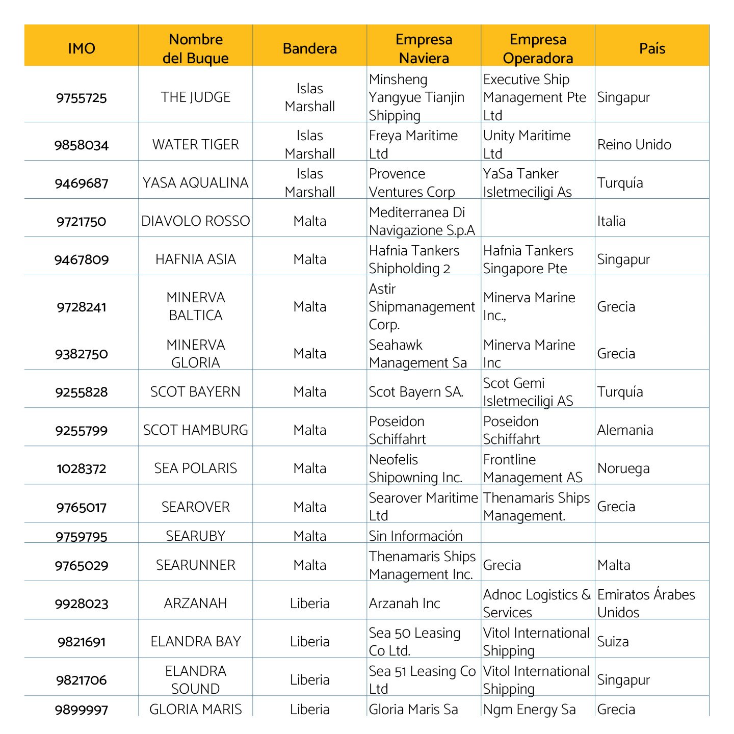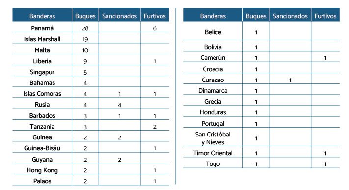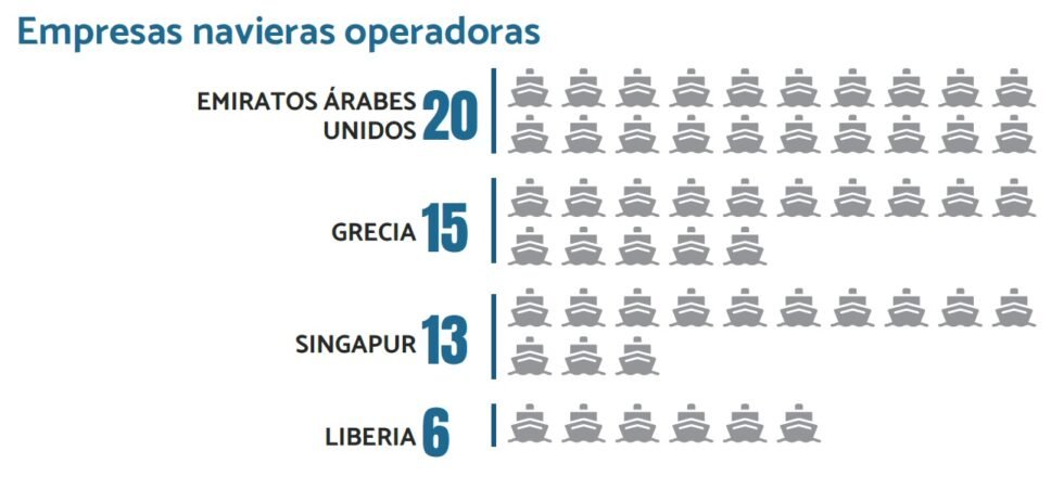 En cuanto a las banderas de los buques sigue siendo Panamá el país más importante con 28 embarcaciones registradas, seguido de Islas Marshall con 19 y Malta con 10.
