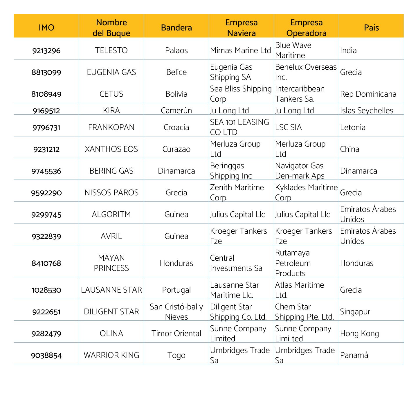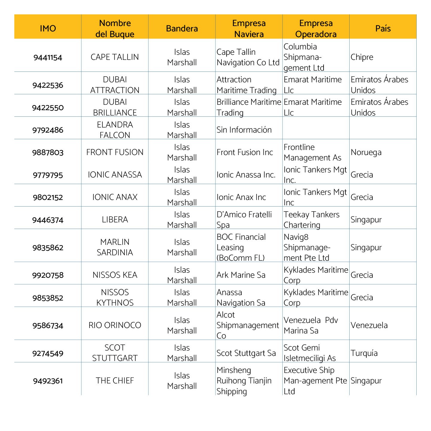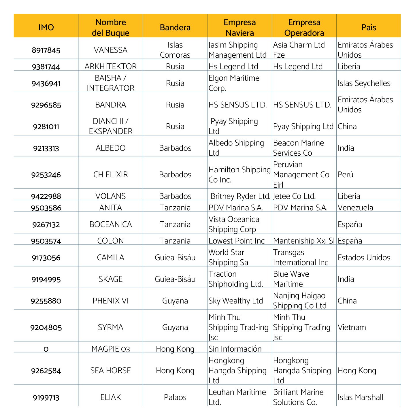 En cuanto a las banderas de los buques sigue siendo Panamá el país más importante con 28 embarcaciones registradas, seguido de Islas Marshall con 19 y Malta con 10.