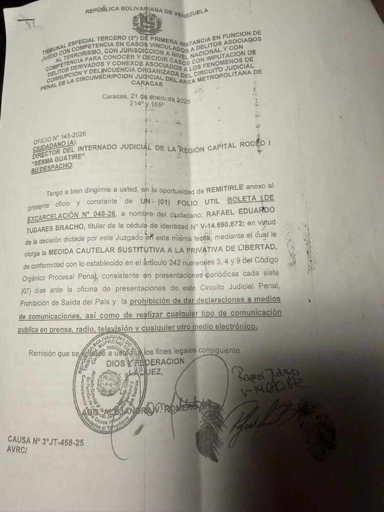 El tribunal que lleva su causa emitió una medida cautelar sustitutiva a la privativa de libertad a favor de Rafael Eduardo Tudares Bracho.