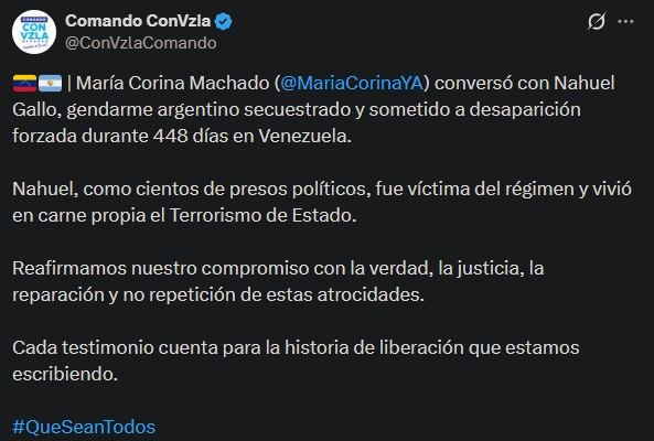 Nahuel Gallo, el gendarme argentino que permaneció 448 días secuestrado y sometido a desaparición forzada en Venezuela, mantuvo este martes una videollamada con la líder opositora y premio Nobel de la Paz 2025, María Corina Machado, en la que compartió detalles de su experiencia y su recuperación luego de salir de su cautiverio en el país caribeño.