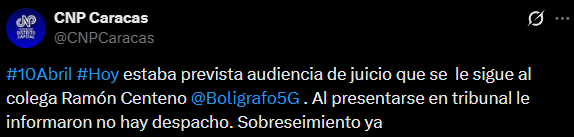 El Colegio Nacional de Periodistas (CNP) informó en redes sociales que «estaba prevista audiencia de juicio que se le sigue al colega Ramón Centeno . Al presentarse en tribunal le informaron no hay despacho. Sobreseimiento ya».