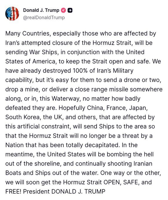 «Esperemos que China, Francia, Japón, Corea del Sur, el Reino Unido y otros que se ven afectados por esta restricción artificial envíen buques a la zona para que el estrecho de Ormuz deje de ser una amenaza para una nación totalmente descabezada», escribió Trump en su red social Truth Social.