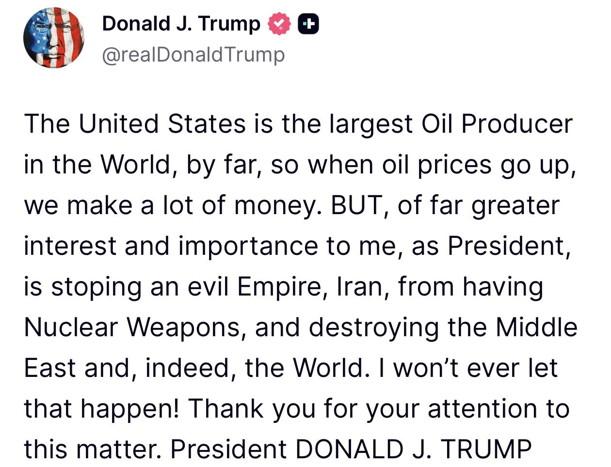 «PERO hay algo mucho más importante para mí, como presidente: impedir que un imperio malvado, Irán, tenga armas nucleares y destruya Oriente Medio y, de hecho, el mundo. ¡Nunca permitiré que eso ocurra!», advirtió el magnate neoyorquino.