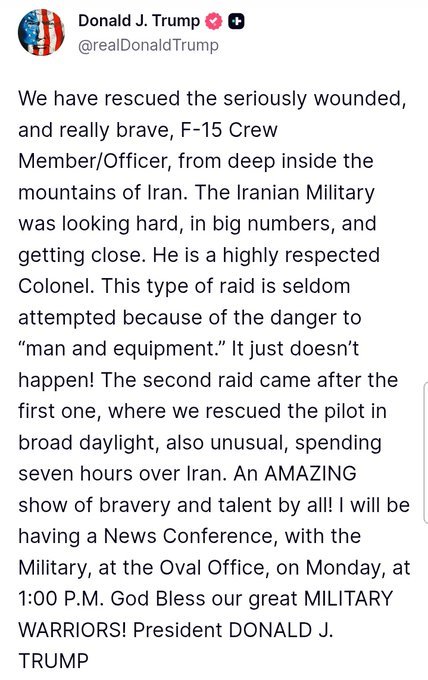 «Hemos rescatado al gravemente herido, y realmente valiente, miembro del F-15 de las profundidades de las montañas de Irán» tras permanecer siete horas en territorio enemigo, detalló el mandatario en un mensaje en su red social, Truth Social, donde añadió que se trata de «un coronel muy respetado».