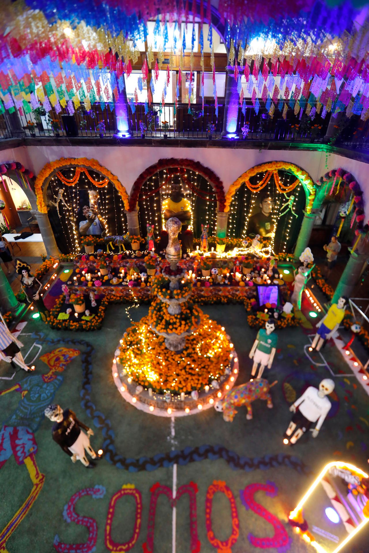 El rey Pelé, quien disputó en Guadalajara la Copa del Mundo de 1070, encabeza la ofrenda en la que no podían faltar las velas, la comida típica, el papel picado y la flor de cempasúchil.