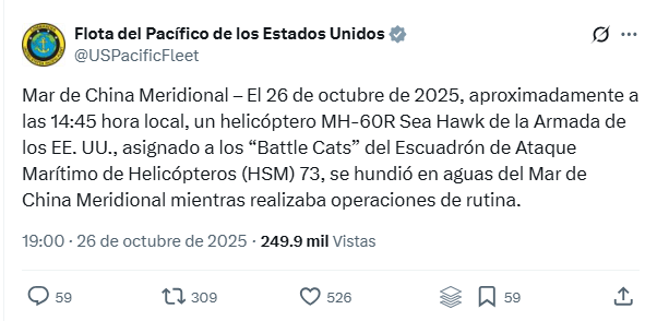 La Flota del Pacífico de Estados Unidos, el comando operativo más grande de la Armada, dijo en una publicación en X que alrededor de las 2:54 pm hora local, un helicóptero MH-60R Sea Hawk asignado a los «Battle Cats» del Escuadrón de Ataque Marítimo de Helicópteros 73 se estrelló en el Mar de China Meridional mientras realizaba operaciones de rutina desde el portaaviones USS Nimitz (CVN 68).