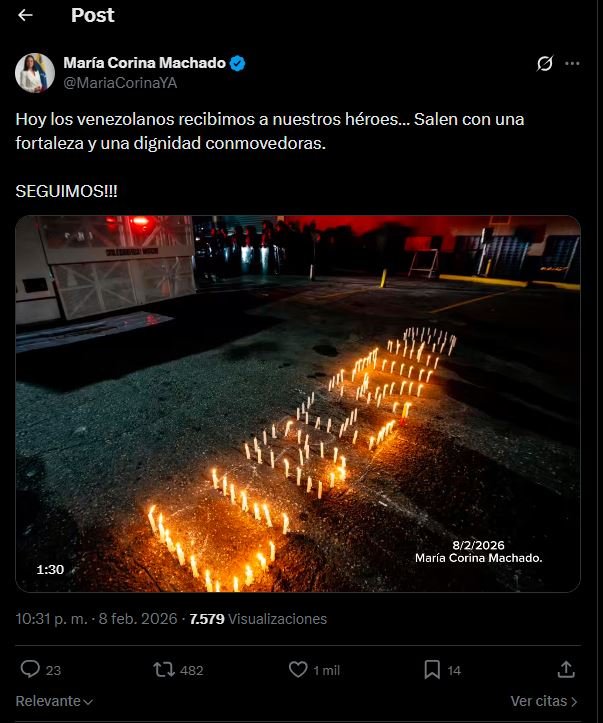 La líder democrática venezolana y ganadora del Premio Nobel de la Paz, María Corina Machado, compartió un mensaje de audio en su cuenta oficial de X la noche del domingo 8 de febrero, dirigido a la nación tras las recientes excarcelaciones de presos políticos en Venezuela.