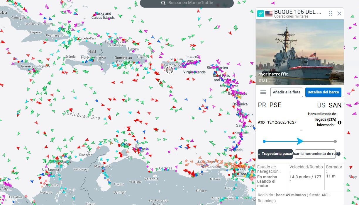 De acuerdo con los datos del sistema AIS consultados en MarineTraffic, el buque de guerra —clasificado como operación militar— navegaba a una velocidad aproximada de 14 nudos, siguiendo una trayectoria que lo integra al grupo de destructores y unidades anfibias que operan en aguas estratégicas del Caribe central.