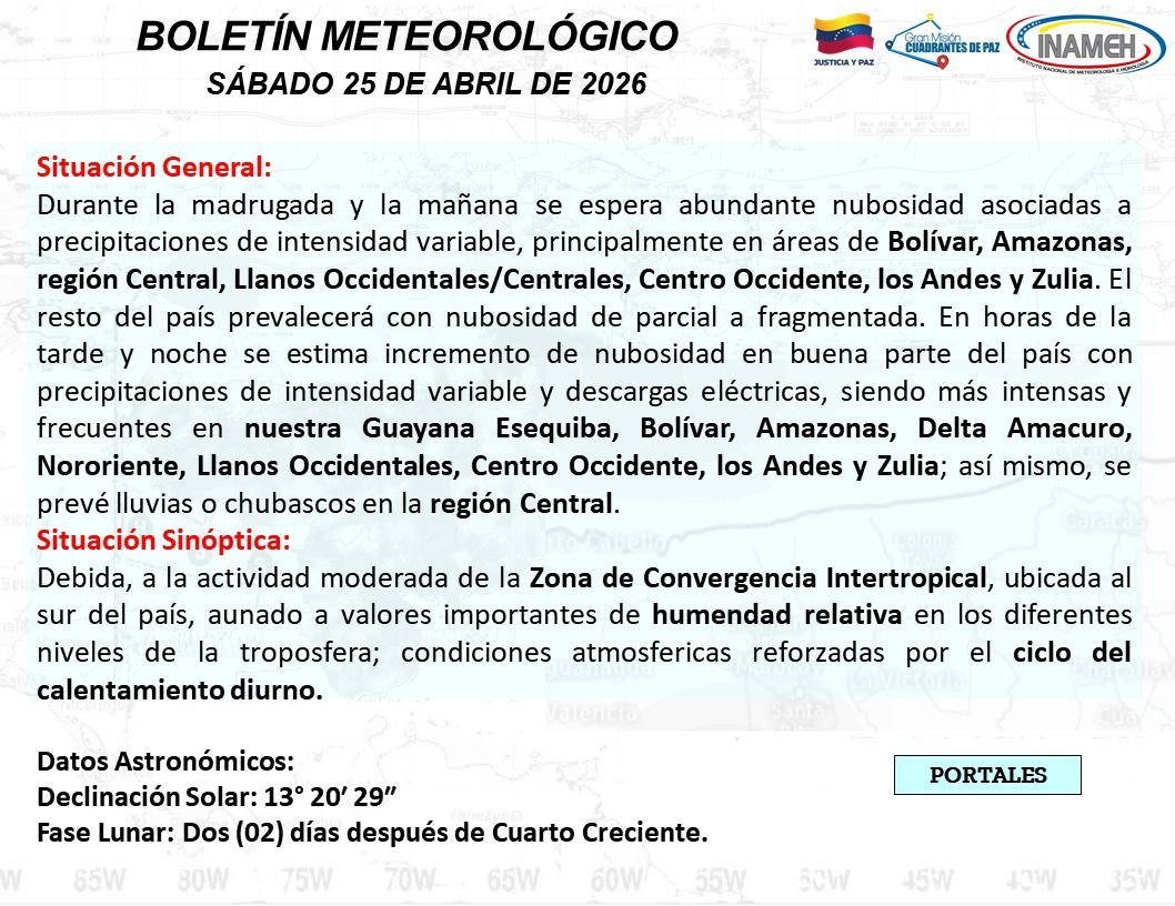 Este sábado 25 de abril, Venezuela inicia la jornada con cielo mayormente nublado y presencia de lluvias o chubascos en distintas zonas del país, de acuerdo con el reporte del Instituto Nacional de Meteorología e Hidrología (Inameh).