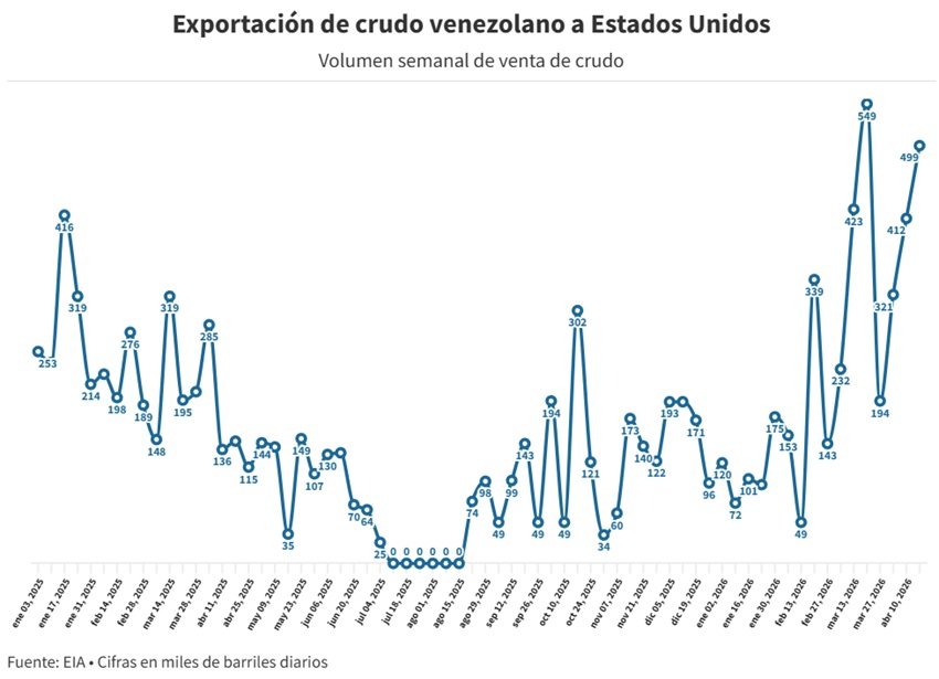 Por otro lado, el promedio móvil de cuatro semanas, que permite observar mejor las tendencias, culminó la semana del 17 de abril en 357.000 bpd, una disminución de 3% en comparación con el lapso previo, pero está 85% por encima de lo que registra en similar semana de 2025.