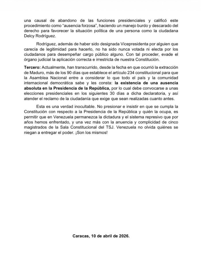 El partido Vente Venezuela, liderado por María Corina Machado, emitió este viernes un comunicado para denunciar que se cumplió la falta absoluta en el Palacio de Miraflores tres meses después de la captura de Nicolás Maduro a manos de soldados estadounidenses.