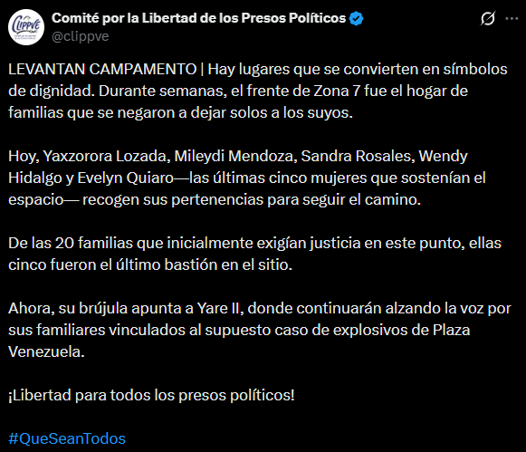 «Hay lugares que se convierten en símbolos de dignidad. Durante semanas, el frente de Zona 7 fue el hogar de familias que se negaron a dejar solos a los suyos. Hoy, Yaxzorora Lozada, Mileydi Mendoza, Sandra Rosales, Wendy Hidalgo y Evelyn Quiaro—las últimas cinco mujeres que sostenían el espacio— recogen sus pertenencias para seguir el camino», anunció el Clippve en redes sociales.