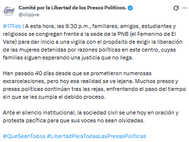 Familiares, amigos, estudiantes y líderes religiosos se congregaron este 17 de febrero a las 6:30 p.m. frente a la sede de la Policía Nacional Bolivariana (PNB) en El Valle, conocida como «el Femenino».