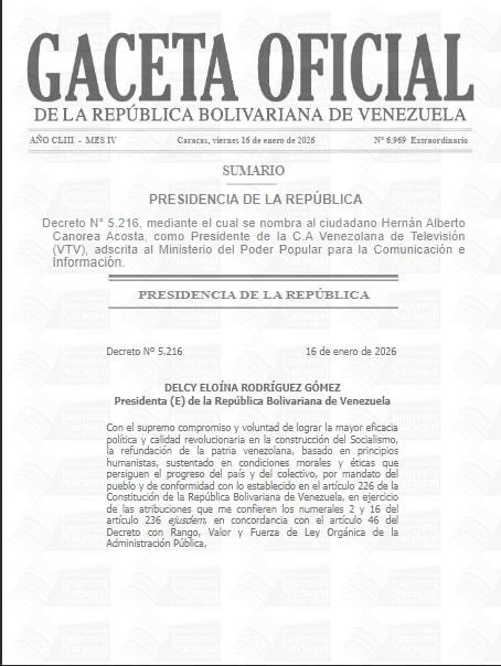 Delcy Rodríguez continúa ejecutando cambios en posiciones clave en la estructura chavista. Ahora, según el decreto N.º 5.216, publicado en la Gaceta Oficial N.º 6.969, el periodista Hernán Canorea ha sido designado como el nuevo presidente del canal complaciente del régimen Venezolana de Televisión (VTV).