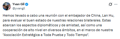 El canciller chavista, Yván Gil, sostuvo un encuentro con el embajador de China, Lan Hu, para «evaluar el buen estado» de sus relaciones bilaterales.