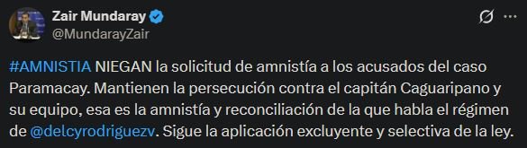 A través de una publicación en su cuenta de X, Mundaray alertó que la medida evidencia una «aplicación selectiva y excluyente» de la Ley de Amnistía. Además, reiteró que los implicados siguen siendo objeto de persecución judicial.